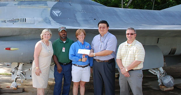 PPG representatives Tom Meyer (far right), plant manager at the Huntsville aerospace facility, and Andy Song (second from right), design engineer at the Huntsville plant, present a check to U.S. Space & Rocket Center representatives (from left) Dr. Deborah Barnhart, CEO, Tommy Siler, exhibit technician, and Ruth Marie Oliver, operations manager for the Aviation Challenge camp, in front of the F-16 jet that will wear donated PPG aerospace coatings in a Red Tail livery honoring the Tuskegee Airmen.