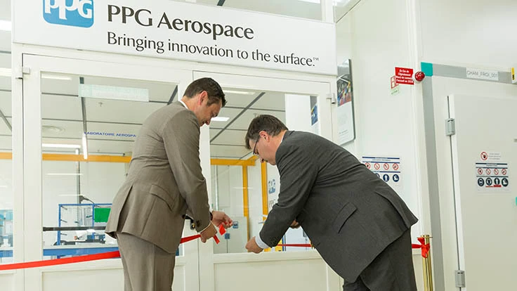 Daniel Bencun, left, PPG aerospace coatings segment manager for the Europe, Middle East, and Africa region, and Pascal Vanhamme, PPG manager of the Marly, France, coatings research center, cut the ribbon during ceremonies to open a new laboratory and inaugurate an Aerocron electrocoat aerospace primer pilot system.
