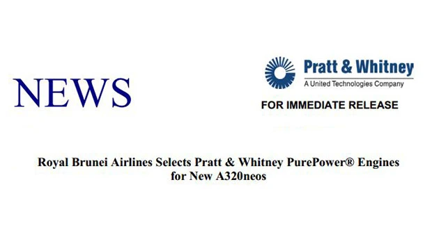 "Royal Brunei is focused on providing its customers a state-of-the-art fleet, and we are proud they have selected Pratt & Whitney PW1100G-JM engines to power their new A320neo family," said Dave Brantner, president, Pratt & Whitney Commercial Engines. "We are confident that our Geared Turbofan engines will meet the high standards Royal Brunei has set for itself."