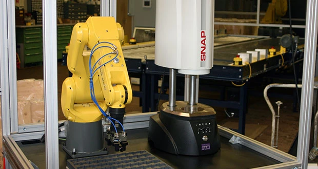 - With telecentric optics and versatile lighting, the SNAP Large-Field-of-View measuring system, from RAM Optical Instrumentation, demonstrating its integration with an automated robotic part handling system, for potentially complete 24/7 lights-out operation.