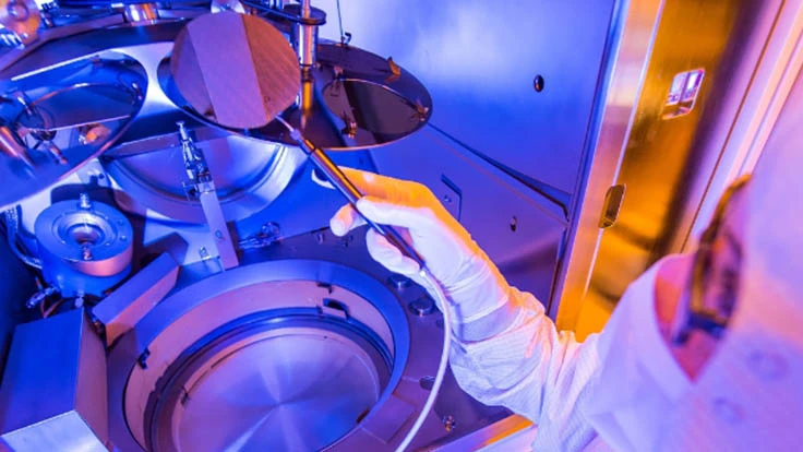 A Gallium Nitride (GaN) wafer undergoes the fabrication process in Raytheon's foundry.