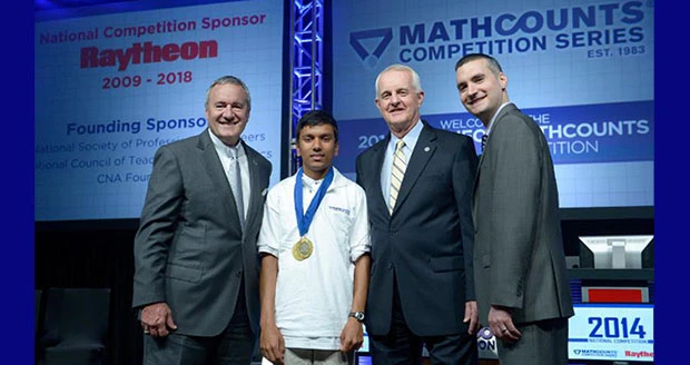 Raytheon Chairman William H. Swanson (left), MATHCOUNTS Chair, Bob Miller (center), and Executive Director of MATHCOUNTS, Lou DiGioia congratulate Swapnil Garg, an 8th-grader from Sunnyvale, Calif., for taking home the 2014 Raytheon MATHCOUNTS National Champion title. The competition brings together 224 top middle school "Mathletes" from across the United States. (Photo: Raytheon Company)