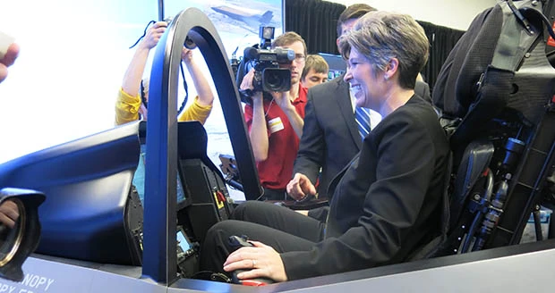 Cedar Rapids, Iowa – Sen. Joni Ernst, Lockheed Martin, and Rockwell Collins executives recently commemorated the delivery of the first Gen III F-35 helmet mounted display system (HMDS). In addition to the HMDS, the Lockheed Martin F-35 Lightning II demonstrator was on site at the Cedar Rapids headquarters of Rockwell Collins for Sen. Ernst to get a first-hand experience of “flying” the military’s most advanced fighter jet following the delivery ceremony.