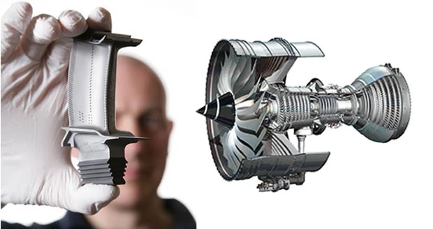 The turbine extracts energy from the hot gas stream delivered by the engine’s combustor and uses it to drive the fan and the compressors. The blades produced in Rotherham operate in the hottest part of the engine at temperatures up to 200° above the melting point of their alloy and sit in a disc that rotates at more than 12,000rpm, creating a centrifugal force equivalent to the weight of a London bus hanging off each blade. They are grown in a special process which ensures that they are created from a single metal crystal to maximize their strength. They are then coated with a heat-resistant ceramic, and when in use, they are cooled with air that passes through a series of precisely placed holes in the blade.