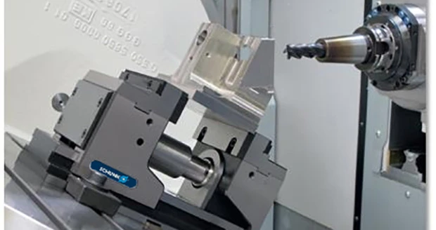 Morrisville, North Carolina – The KONTEC KSX vise from SCHUNK is a powerful clamping system for simultaneous 5-axis machining. The compact and easily accessible clamping system can handle tool-free adjustable clamping forces between 4kN and 40kN, (measured directly at the workpiece.) This offers a safe and secure hold, even for minimum clamping surfaces. The support surfaces at a height of 211mm ensure that the workpieces are easily accessible from all sides. With just one lever rotation, they are quickly clamped, resistant to vibrations, and have a high repeat accuracy. Since the unit is draw bar actuated, the bending load at the base body is highly reduced. Moreover, the long guiding system and the arrangement of the clamping mechanism ensure a very stiff, dimensionally stable set-up. The drive and the adjustment mechanism of the 5-axis clamping vise are completely encapsulated and thus protected against chips, dirt, and coolant, and the easy-to-clean design reduces build-up of chip clusters.