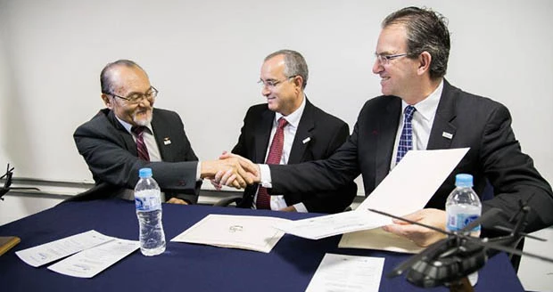 Sikorsky Vice President Chris Van Buiten (right) and ITA Vice Dean Fernando Sakane shake hands to seal the new collaboration with ITA. Antonio Pugas, Sikorsky Regional Sale Executive for Latin America looks on.
