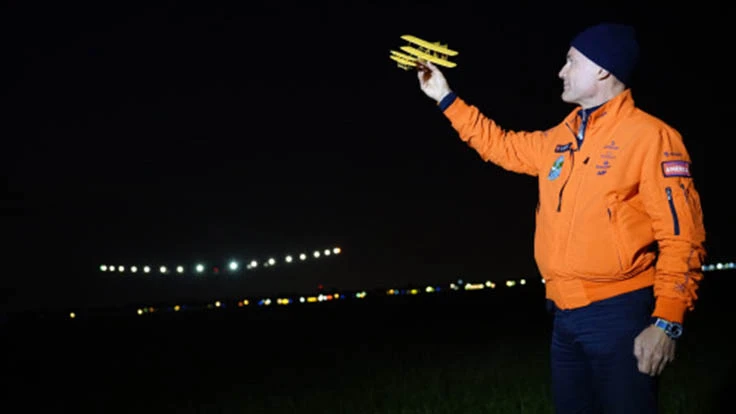 Dayton, Ohio – Solar Impulse 2 (Si2) with André Borschberg as pilot landed at Dayton International Airport at 1:56am UTC, on May 22, 2016, and 9:56pm EDT on May 21, 2016. The solar-powered aircraft left Tulsa International Airport at 9:22am UTC, 4:22am CDT on May 21, 2016, for a flight that lasted a total of 16 hours and 34 minutes. Bertrand Piccard welcomed his colleague to the home city of the Wright Brothers with a miniature replica of the Wright Flyer. Strong tailwinds helped Si2 reach Dayton about a half-hour ahead of schedule, and just behind persistent rain.