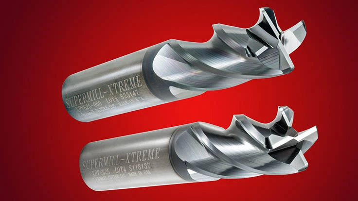 Berlin, Connecticut – Supermill LLC is introducing the XPV series carbide end mills for roughing or finishing of titanium and other difficult materials and featuring 4-flute design with variable helix, variable pitch and progressive rake angles, full eccentric relief, sharp or radius corners, and AlCrN coating.