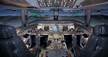 SAT's new Frankfurt E-Jet 190 simulator has been supplied by CAE, a professional manufacturer with whom SAT has been collaborating closely for several years now. The simulator itself is state-of-the-art, with features that include a dual head-up guidance system and the latest CAE Tropos visual system. The projectors boast an extremely high resolution - an asset that will be greatly appreciated by the pilots who train on it. The simulator also has the newest Aircraft Avionic Software (EPIC load 25.2) installed, which replicates the very latest version of the original aircraft concerned.