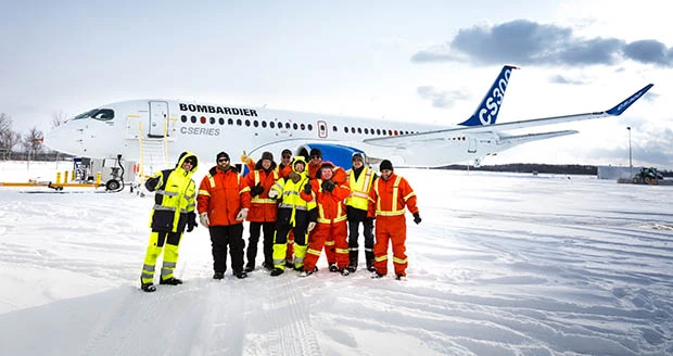 Members of Bombardier’s flight test team celebrate the CS300 aircraft’s pending first flight.