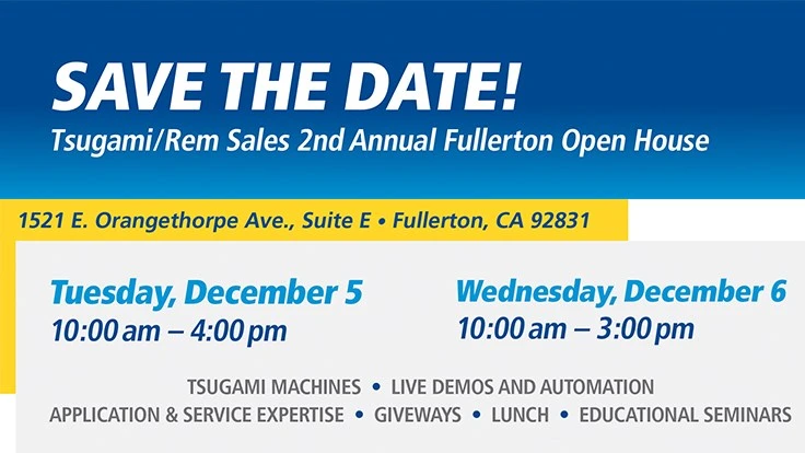 “Our annual Fullerton open house is the perfect chance for anyone interested in learning more about the capabilities and power of Tsugami to stop in, look at the machines, and speak with our experts. We pride ourselves in the engineering and customer support behind Rem Sales’ products and partnerships and look forward to welcoming all of the open house attendees,” shares Michael Mugno, vice president, Rem Sales.