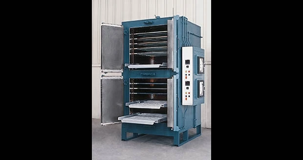 Round Lake, Illinois – No. 979 is a 850ºF (454ºC), electrically-heated, universal style oven from Grieve, suitable for various machine shop heat treating operations. Workspace dimensions of this oven measure 36" x 36" x 36" in each of the two compartments. 24 kW (12kW per zone) are installed in Incoloy-sheathed tubular elements to heat the dual oven chambers, while a 600cfm, 1/2hp recirculating blower provides front-to-back universal airflow to the workload in each compartment.
