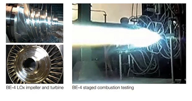 The BE-4 is a liquid oxygen, liquified natural gas (LNG) rocket engine that delivers 550,000-lbf of thrust at sea level. Two BE-4s will power each ULA booster, providing 1,100,000-lbf thrust at liftoff. ULA is investing in the engineering and development of the BE-4 to enable availability for national security, civil, human, and commercial missions. Development of the BE-4 engine has been underway for nearly three years and testing of BE-4 components is ongoing at Blue Origin's test facilities in West Texas. Blue Origin recently commissioned a new large test facility for the BE-4 to support full engine testing.