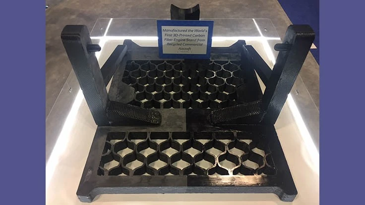 Memphis, Tennessee-based Universal Asset Management (UAM) has used recycled carbon fiber reinforced polymer (CFRP) from commercial aircraft to 3D-print an engine stand. CFRP collected through UAM’s proprietary process, filtered for purity and refined into pellets, was used as raw material for 3D-printing to demonstrate that second-generation carbon fiber material is suitable for additive manufacturing.
