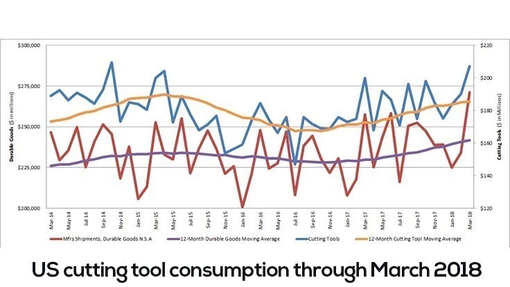 “The March cutting tool numbers continue to tell a story of strength and growth for our industry, however, there are potential negative clouds forming on the horizon. The potential steel tariffs are creating indecision in the marketplace and have purchasing agents scrambling to develop alternate plans for supply. Shortages will cause disruptions and could impact growth as we move forward,” says Steve Stokey, executive VP and owner of Allied Machine and Engineering and chairman of AMT Board of Directors.