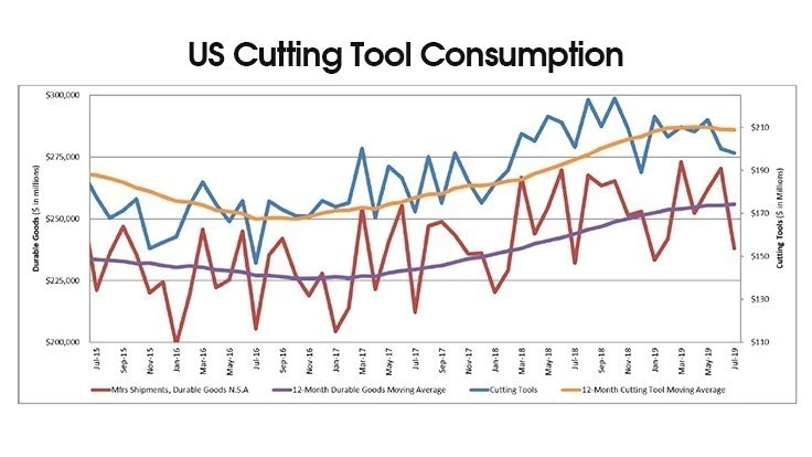 “The Purchasing Managers’ Index dip below 50 in July suggests that the year over year growth in cutting tools is likely to turn negative when August shipment levels are published. Still, some industries demand for cutting tools continues to expand as cautiousness shifted production downstream deeper into the supply chain or into contract machine shops,” said Dave Burns, President of Global Business Advisory Services LLC.