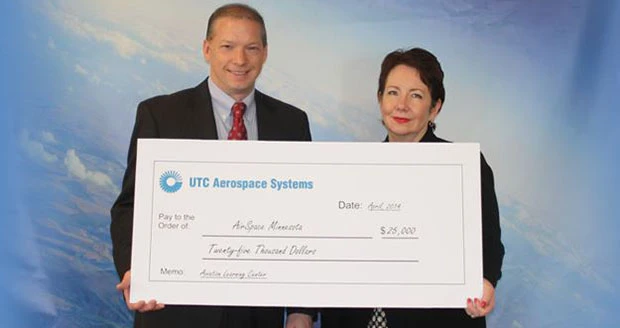 Charlotte, N.C. – UTC Aerospace Systems, a unit of United Technologies Corp., is a lead sponsor of AirSpace Minnesota's new Aviation Learning Center (ALC), and the sole sponsor of the ALC wind tunnel. The company donated $25,000 to the project as part of its ongoing efforts to promote science, technology, engineering, and math (STEM) education. The donation was presented to Kristi Rollag Wangstad, president of AirSpace Minnesota, by Mark Skarohlid, general manager at UTC Aerospace Systems' Sensors and Integrated Systems business in Burnsville, Minn.