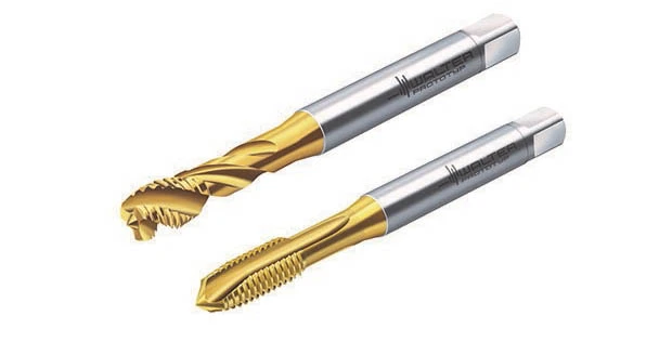 The two new taps offer superior performance characteristics with cost-savings. The TC115 blind-hole tap has a 45° helix angle for thread depth of 3xD, and a C form chamfer. The TC216 through-hole tap features a spiral point for forward chip evacuation and thread depth of 3.5xD. Both have HSS-E bodies and are available with either TiN or vaporized coating. The vaporized variant is a good choice for tough ISO M materials because it increases process reliability, while longer tool life and higher cutting speeds are just some of the benefits of the TiN coating.