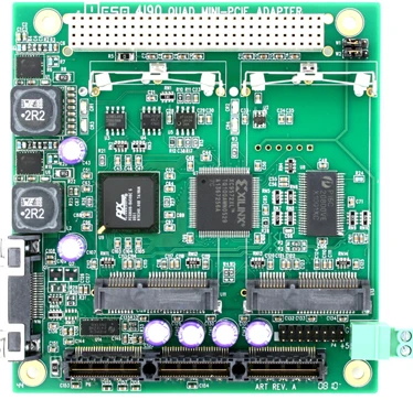 The 4I90 is a quad type Mini-PCIE adapter for the PC/104-Express bus. The 4I90 allows use of 4 Mini-PCIE cards like IEEE 802.11 wireless LAN cards in a PC/104-Express system. The 4I90 uses a PCIE bus bridge so that only a single one lane PC/104-Express‘slot’ is required. The 4I90 has a cabled PCIE expansion connector for downstream cabled PCIE devices.