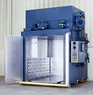 No. 940 is a gas-fired 500°F (260°C) walk-in oven from Grieve, currently used for curing brake friction materials at the customer's facility. Workspace dimensions are 72" wide x 96" deep x 78" high. 400,000btu/hr are installed in a modulating natural gas burner inside the oven, while 700,000btu/hr are installed in a modulating natural gas afterburner. The oven's initial exhaust passes through the 1,400ºF afterburner. A 6,000cfm, 5hp recirculating blower provides combination airflow to the workload.