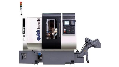 Quicktech i-42 ROBO and i-60 ROBO 4-axis mill/turn centers feature integrated 6-axis Mitsubishi robots for fast, automated loading and unloading of medium-diameter (i42: 42mm/1.68", i60: 60mm/2.36") bar stock. In addition to carrying out turning, the machines can perform complex milling with standard live tools. An optional 360° B-axis further extends milling capabilities.