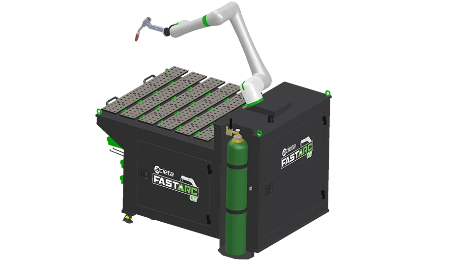 The FastARC CW includes a FANUC CRX-10iA/L 6-axis robot mounted on a mobile platform to move quickly between production areas. The system is compatible with Fronius, Lincoln Electric and Miller welding units.