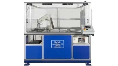 Bel Air Finishing has developed the AutoHone, a state-of-the-art reverse drag finisher. Unlike traditional drag finishers, the reverse drag finisher rotates media instead of parts. It then dips parts into the flowing media held within a rotating bin. The AutoHone combines this with robotic automation enabling a turnkey solution for deburring, polishing, cleaning, and drying. The robot arm enables 5-dimensional motions meaning, parts can be inserted into finishing media at unique angles tailored to achieving specific finishing specifications. Following the finishing process, the robotic arm cleans the part within the optional ultrasonic cleaning station and can also dry the part in the optional drying station before placing the part back into the tray.