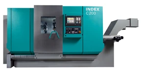With three 14-position tool turrets, 160mm chuck size, and identical powerful main and counter spindles, the space-saving INDEX C200s are designed for fast, cost-competitive production of medium complexity parts turned from 65mm to 90mm diameter bar stock in the automotive, fittings, fluid power, and medical industries.