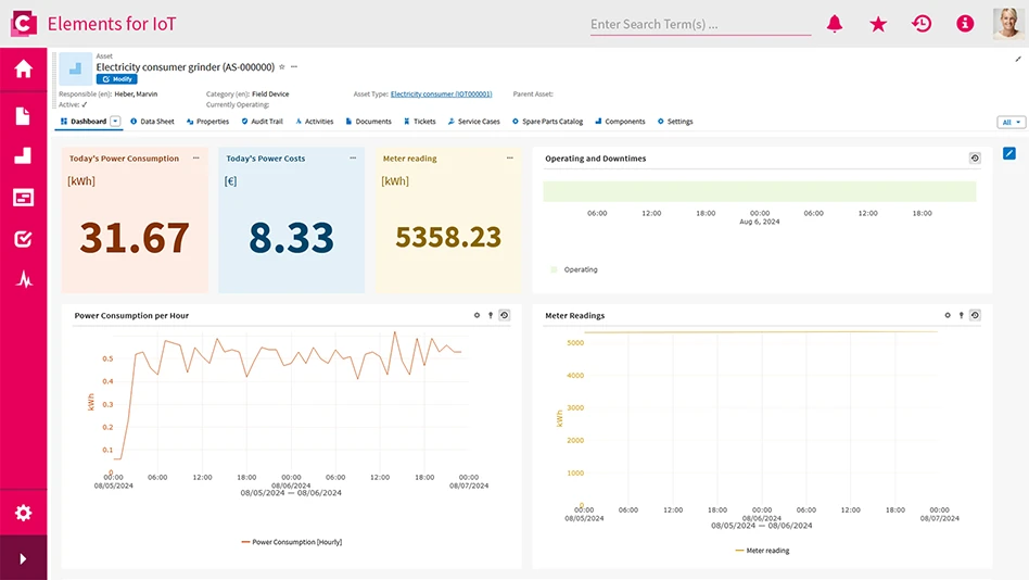 Meter readings are either recorded automatically, entered manually, or imported from a file. Thanks to CONTACT Elements’ no-code approach, users can create digital twins for production plants or energy meters themselves and configure dashboards.