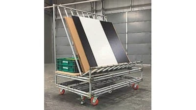 Greer, South Carolina – Creform Corp., a manufacturer of unique products for material handling and commercial use, has designed and built a small batch cart that features a large-angled shelf for panel storage on one side that holds the panels securely for in-plant transfer. The vertical storage also makes finding the right length easy.