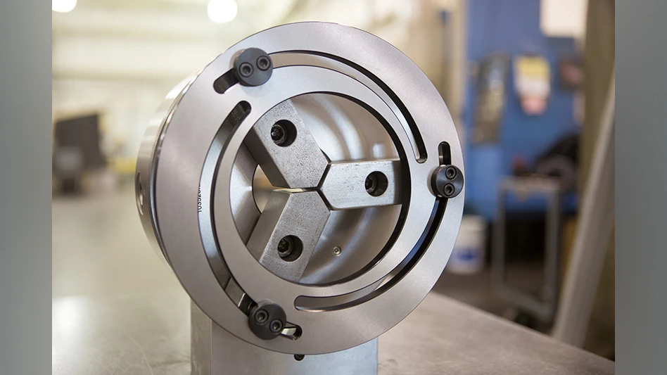 Dillon jaw forming rings lessen the amount of jaw stock removal required during parts set-up, thus maximizing jaw life for cutting and forming operations – and they are now available in diameters up to 21-inches. They provide a more uniform grip on the workpiece and mount in direct contact with the top jaw to preload the chucking system. Jaws can be more precisely machined to provide a firmer grip on the workpiece. Self-centering jaw forming rings attach to the front of jaws without tools, so installation is fast and simple, and set-up times are slashed. Use of this device will provide a jaw surface true to the machine centerline, reduce set-up times, and increase up-times for running machined parts. They provide uniform pressure on jaws for a more consistent bore on large diameter chucks. They compensate for “jaw lift” even in worn chucks, which yields better part concentricity. Ideal wherever soft jaws, round jaws, and full-grip jaws are used.