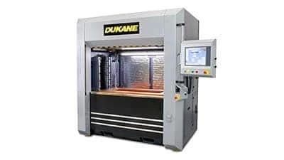 Incorporating servo driven controls eliminates hydraulic power units. It includes four continuously supported rails with eight reciprocating bearings to eliminate table chattering, improve table alignment, and eradicate unwanted machine resonance. Large mechanical mass of the linear vibration head coupled with the solid welded tubular steel frame construction eliminates machine failure due to vibration process and provides one of the quietest machines in the industry, reducing operator fatigue.