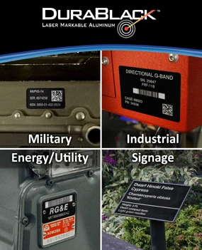 DuraBlack is a CO2 laser markable aluminum that meets the requirements of MIL-STD-810G for resistance to abrasion, temperature, weather, salt-spray and fluid exposure. The new product was engineered to survive harsh military, industrial and outdoor operating environments without a protective topcoat.