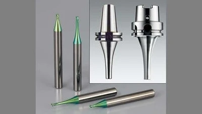 Emuge Corp.’s micro end mills feature a patented neck design with up to 10x diameter, enabling reach into deep contours. For optimal machining performance, a high radial bending strength withstands alternating stress on the cutting edge and relieved neck. The Emuge end mills offer high speed cutting finishing of 2D and 3D contours, and are offered in square, ball nose, and torus end types. Featuring a short, stable cutting geometry, the end mills are available in solid carbide and CBN designs.