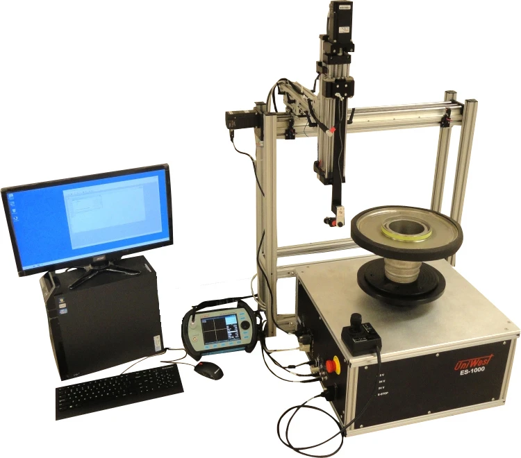 Engineers at UniWest have developed a new tabletop, 3-axis, semi-automatic ECT inspection system. The ES-1000 provides precision eddy current testing for rotationally symmetric parts, such as engine disk bores and webs.