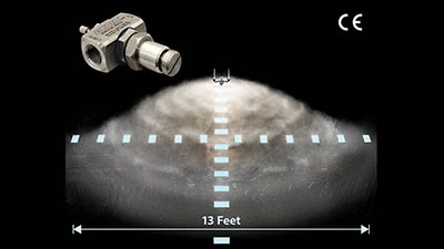 Exair's 1/2 NPT internal mix spray nozzle atomizes fluid and sprays in a 360° hollow circular pattern up to 13ft in diameter. These nozzles are useful where a liquid application is needed in a broad area, such as dust suppression, humidification, and cooling. They can also be used to coat the inside of large diameter pipe or duct. By combining liquid and compressed air inside of the air cap, the nozzles produce a fine mist of atomized liquid that can be adjusted with liquid flows from 10.8gal/hr to 150gal/hr.