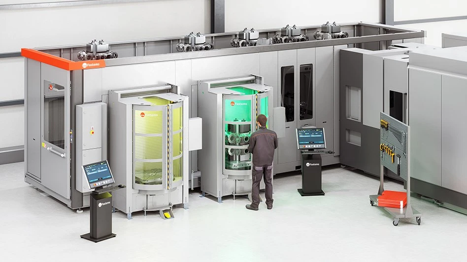 Fastems introduced Version 8 of their Flexible Pallet Container (FPC 8), providing easy and extendable automation for one to three CNC milling machines with 400 mm to 1,000 mm pallets. The FPC 8 also includes the new FPC-1800, which accommodates twelve to 36 pallets measuring 630 mm to 800 mm in a small 2.4 x 9.2 -meter footprint. Featuring a library of hundreds of ready-made machine interfaces for over 100 brands, the FPC 8 integrates with horizontal machining centers and offers machine tool utilization of up to 85 percent, short setup times, and high lights-out production capacity. The system can be extended to include up to two additional containers, increasing capacity to 24 or 36 pallets running on two to three machines.
