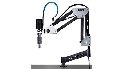 Wapakoneta, Ohio –FlexArm Inc. introduces the GH-60 hydraulic tapping arm with capacity to 2", even in laser-cut holes. It has a reach from 20" to 85" and operates at 55rpm or 275rpm to deliver torque up to 811 lb-ft. Full 360° movement allows operators to position taps with guaranteed perpendicularity. Its 480V power source provides tapping capacities from 1/2" to 2". Five quick-change tap holders, and semi-tap lubrication are included with each tapping arm. With fast setup times and reduced tap breakage, FlexArm GH-60 tapping arms are an alternative to tapping large diameter holes manually, or via CNC, even laser cut holes without reaming or preparation.
