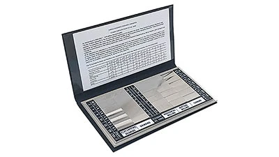 Economy, composite set consists of 30 specimens 7/8" x 3/8" of electroformed solid nickel. Each type of surface finish, such as flat lapping, reaming, grinding, horizontal milling, vertical milling, and turning, is truly and consistently reproduced to give the operator or designer a realistic idea of the feel, appearance, and texture of the machined components. A set of instructions is included with each set. Quick and easy comparisons can be made, eliminating costly checking methods, saving valuable production time, and stopping the production of scrap caused by poor finishes.