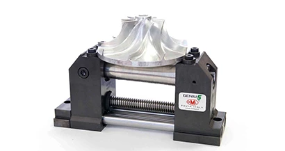 The Genius vise is specifically designed for precision 5-axis milling with trunion-table machines. The adaptable vise easily secures oddly-shaped workpieces, such as turbine blades and blisks, and presents them to the spindle with minimal obstruction, reducing setups and ensuring repeatability of 0.0008".