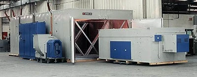 Oven controls on No. 976 include a 13,500cfm powered forced exhauster (shown in the left foreground of the photo) and other safety equipment required to handle up to two gallons of flammable solvent at 370ºF (~188ºC). Also onboard are a digital programming temperature controller, SCR power controller, and motorized dampers on the intake and exhaust for accelerated cooling and rapid purging. The jumbo walk-in was built to NEMA 12/NFPA 79 electrical standards.