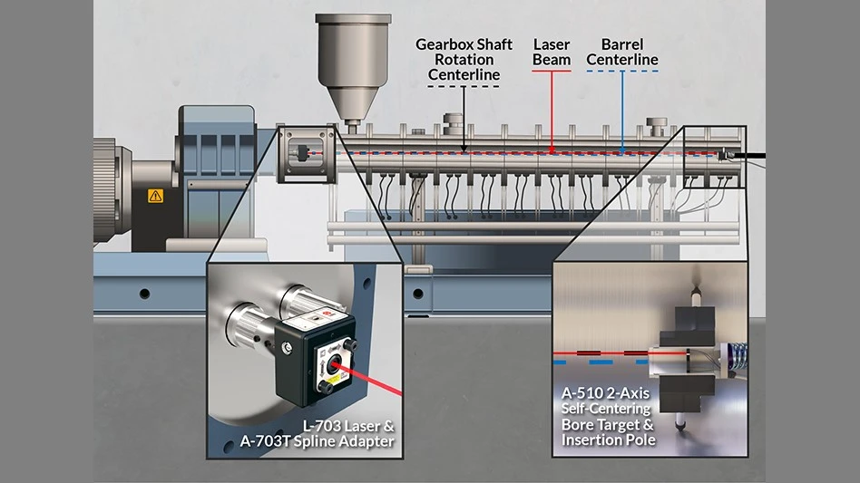 Hamar Laser’s new L-703 is combined with the company’s patented self-centering bore-measuring targets for extruders in the L-703 Twin-Barrel Extruder Alignment System kit, which also includes Hamar Laser’s new A-703T Spline-Shaft Adapter, A-510 2-Axis Target, bore adapters, readout, and accessories. Additional L-703 Laser kits for other applications, including bore and spindle alignment and surface plate calibration, will roll out later this year.