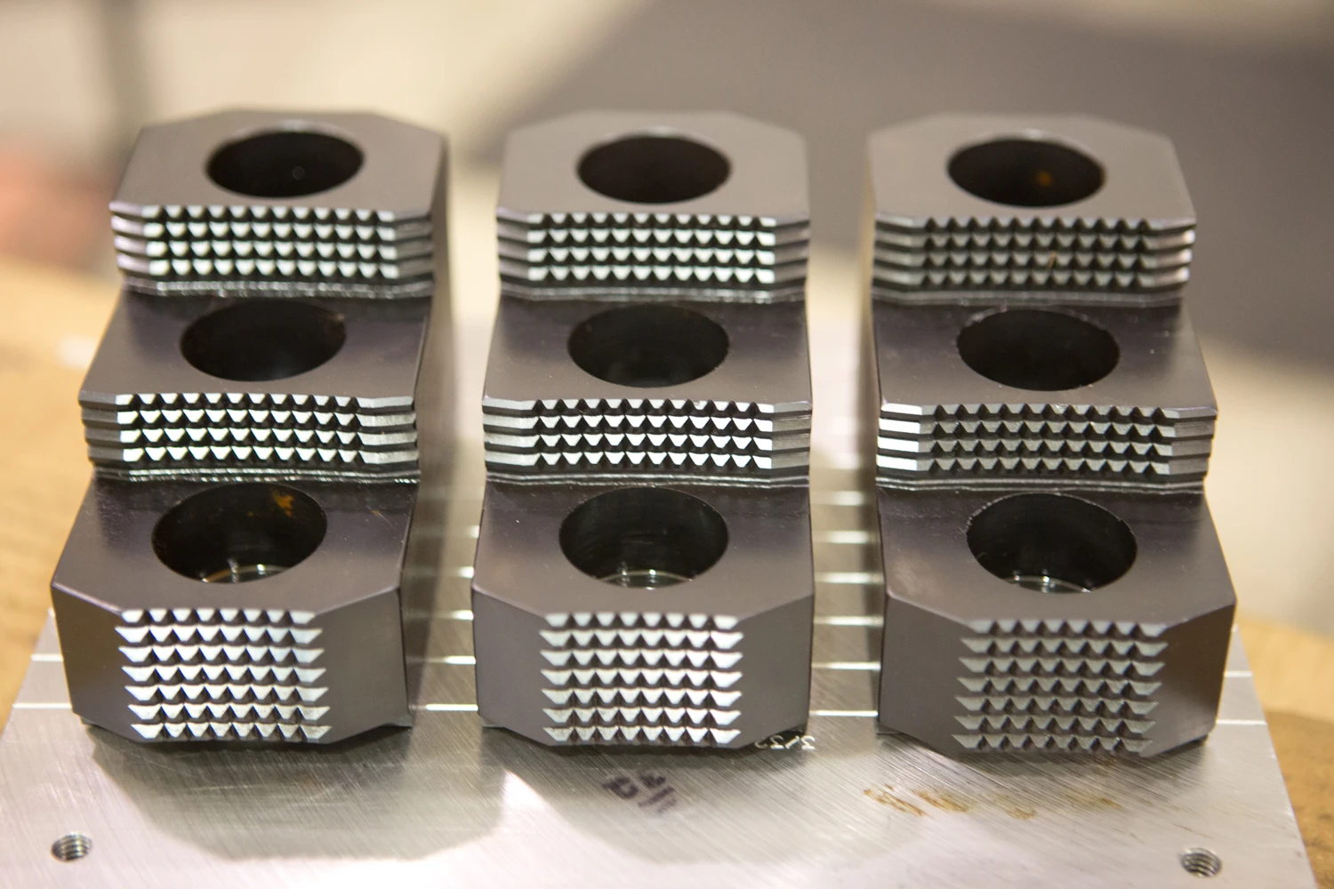 Hard Jaws from Dillon Manufacturing, Inc., which feature diamond shaped serrations for increased pull down effect which reduce part slippage and push back from using a bar feeder, will be among the items featured in IMTS booth #W-2134. The aggressive serrations on the gripping surfaces are also ideal for cast parts, scaly parts or parts with imperfections. Manufactured of 1018 or 8620 steel which is then case hardened and coated with black oxide for corrosion resistance, the hard jaws provide long jaw life and greater precision with ground locating services. They are available in different mounting configurations including serrated, T&G, Acme, and square serrated key types to fit all brands of chucks. Dillon chuck jaws are very versatile with multiple radiuses for both inside and outside clamping making then ideal for any size run. Dillon also offers special or modified hard jaws with industry-best turnaround time, which saves time and money by reducing down time.