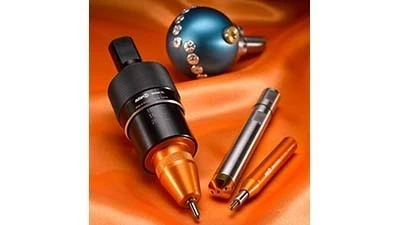 These tools can function with or without rotation and usually without height adjustment on the spindle, resulting in a high-speed, highly efficient marking process and no degradation of the substrate. Very thin material as well as cylindrical workpieces can be easily marked, using AMF tools.