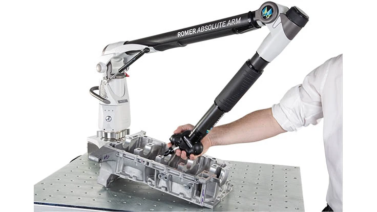 North Kingstown, Rhode Island – Hexagon Manufacturing Intelligence has added the ROMER Absolute Arm 77 Series to its portable coordinate measuring machine (PCMM) product line. The 77 Series is designed to provide absolute accuracy for high-end 3D measurement applications. The advanced PCMM achieves nearly a 20% improvement in scanning accuracy and a 15% improvement in touch-probe measurement accuracy over the popular 75 Series. The new series is available in five sizes from 2.5m to 4.5m measuring volumes.
