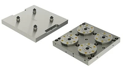 The second set of additions is comprised of aluminum or steel fixture plates with pre-installed pull-studs. The two-stud model is suitable for two module subplates and includes one ZPS stud and one timing stud. The four-stud model, suitable for four module subplates, includes ZPS and timing studs plus two additional clearance studs. Custom sizes available to suit specific needs.