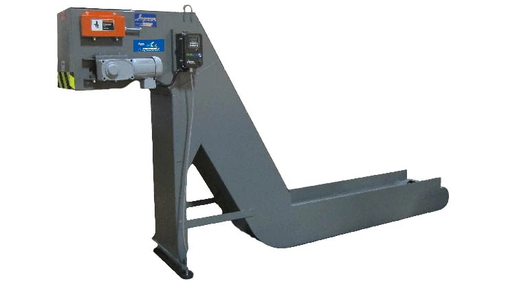 The unit employs a twin-stacked conveyor arrangement at the lower curve and through the incline and chip discharge of the system. The primary and secondary belts run in opposite directions to grab hold of chips, compact them, and securely carry them up steep inclines, eliminating the risk of conveyor jams caused by chip balls tumbling back down the conveyor.