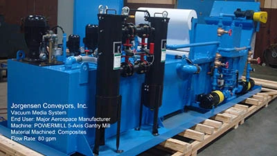 Mequon, Wisconsin – Vacuum Media Filter efficiently removes fine chips and grinding sludge and is effective in applications requiring coolant clarity to 10µm. Jorgensen’s vacuum media filtration systems are proven in various CNC grinding, metal cutting, and demanding composite machining applications at aerospace OEMs and top tier parts suppliers.
