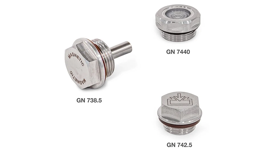 The magnetic plugs GN 738.5 look similar, except they have an integrated bar magnet extending into the fluid to reliably capture any iron particles damaging gears.
