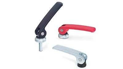 The RoHS compliant GN 927 clamping levers with eccentrical cam are used for rapid clamping and releasing operations. In contrast to a clamping operation using threads, these levers permit torque-free clamping. The lever has been designed to insure its movement cannot exceed the maximum clamping position. In addition, there are no loose components, since all are assembled and mounted in their correct order. With these clamping levers, thrust forces of up to 1.8 lb (8N) can be obtained.